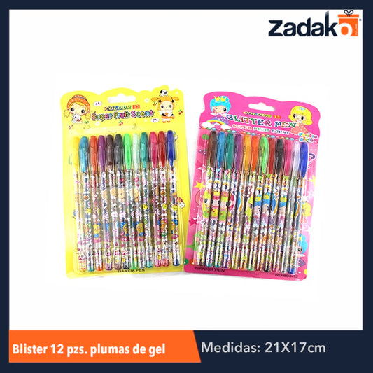 ZP-0176 BLISTER 12 COLORES PLUMA DE GEL, CON 1 PZ O CAJA CON 160 PZS