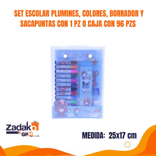 E-752/E-753 SET ESCOLAR PLUMINES, COLORES, BORRADOR Y SACAPUNTAS CON 1 PZ O CAJA CON 96 PZS