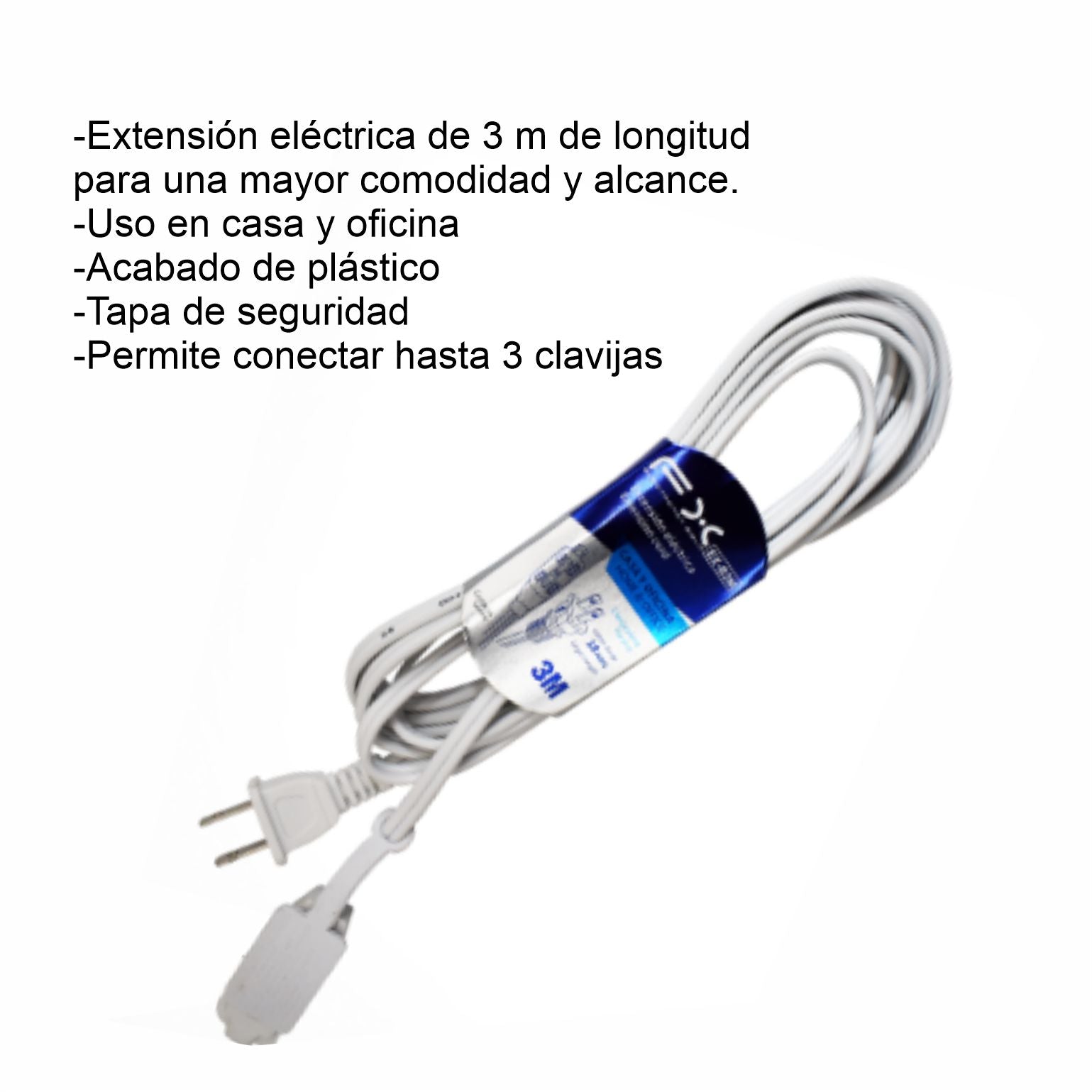 GPM-8639 EXTENSION ELECTRICA BLANCA 3 MTS,ACABADO DE PLASTICO,TAPAS DE SEGURIDAD,.PERMITE CONECTAR HASTA 3 CLAVIJAS ATERRIZADAS CON 1 PZ O CAJA CON 120 PZS