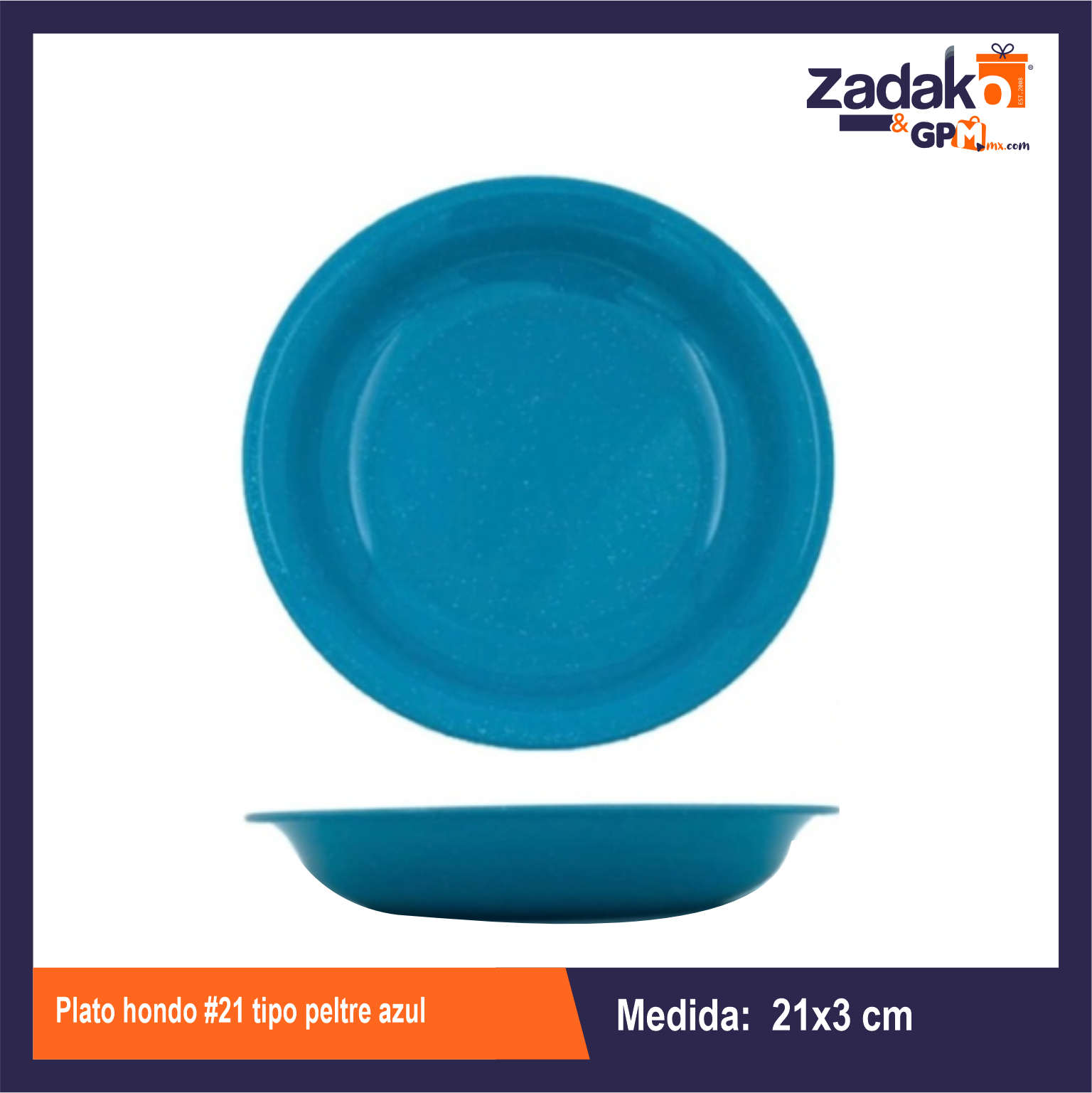PLATO HONDO #21 TIPO PELTRE AZUL DE PLASTICO CON 1 PZ O CAJA CON 100 PZS