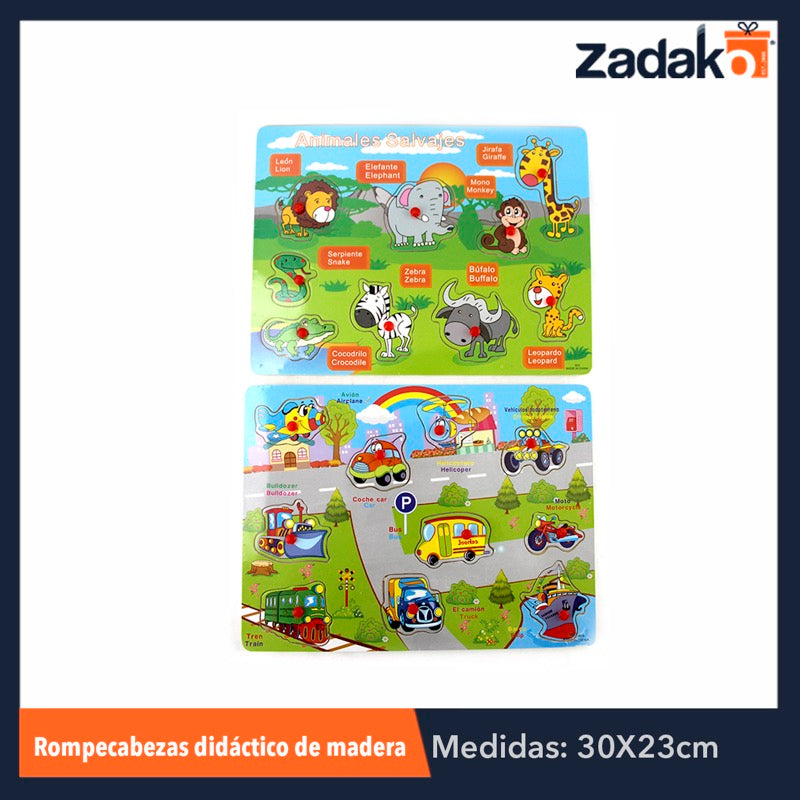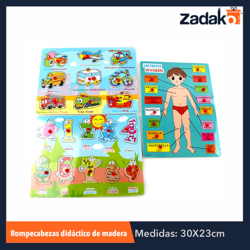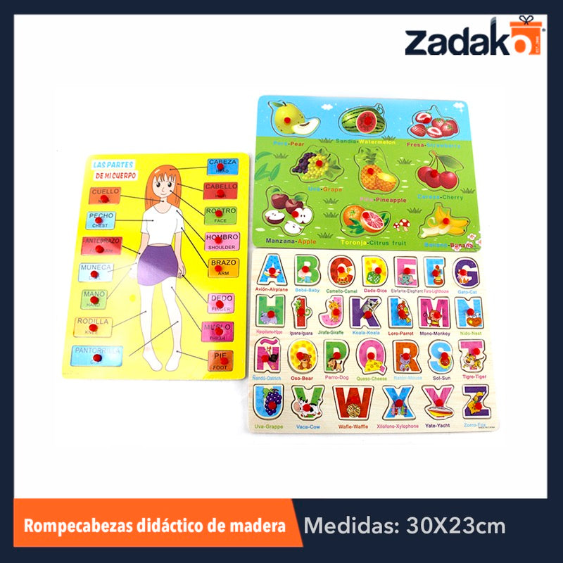 ZJ-0432 ROMPECABEZAS DICACTICO DE APRENDIZAJE EN INGLES Y ESPAÑOL DE MADERA DE 30x22.5 CM, CON 1 PZ O CAJA CON 100 PZS