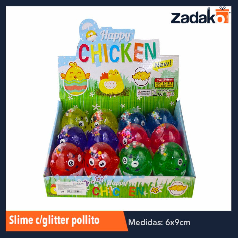 ZJ-1007 SLIME C/GLITTER POLLITO CASCARON, CON 12 PZS, O CAJA CON 16 PQTS