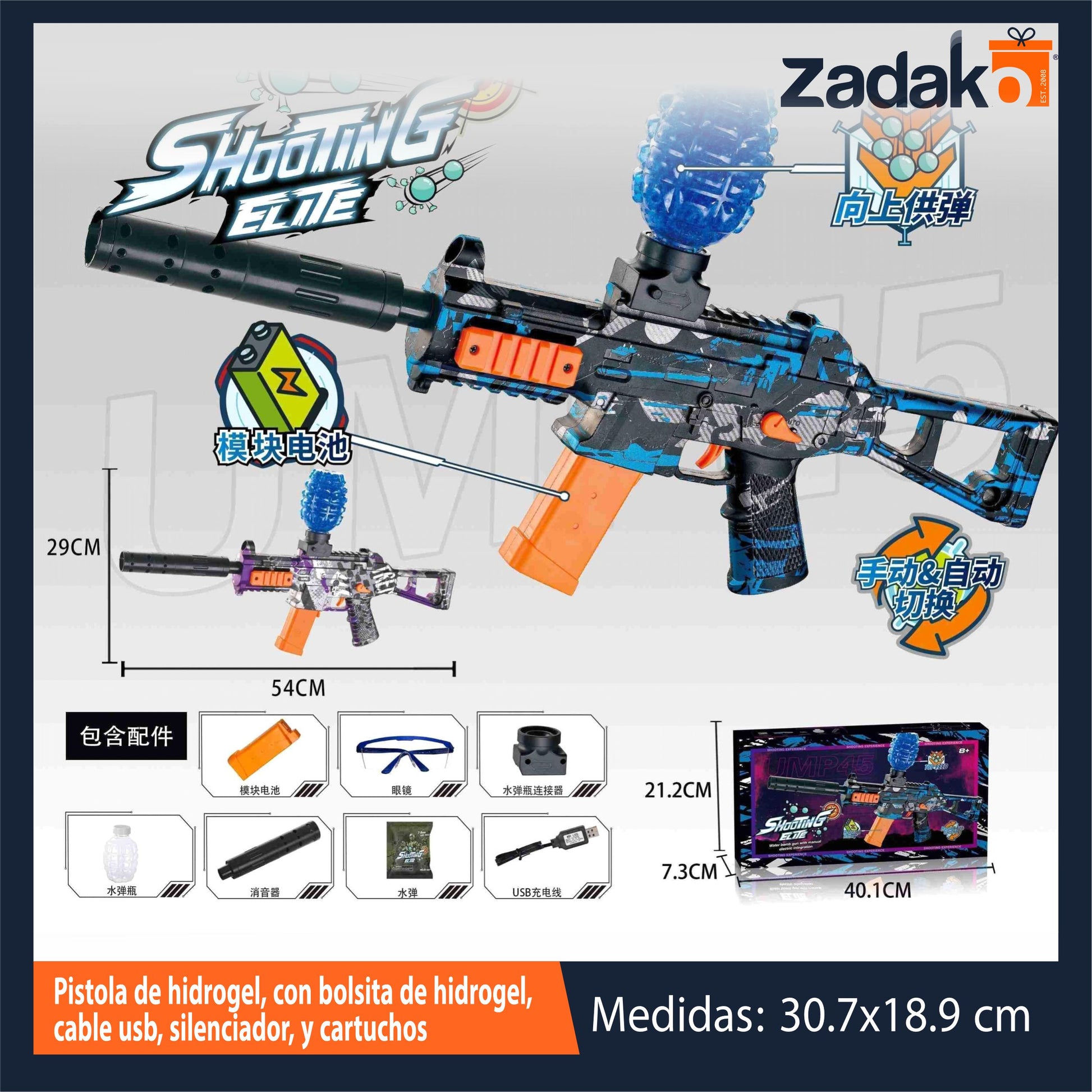 ZJ-2427 PISTOLA DE HIDROGEL, CON BOLSITA DE HIDROGEL CON CABLE USB CON 1 PZ O CAJA CON 36 PZS
