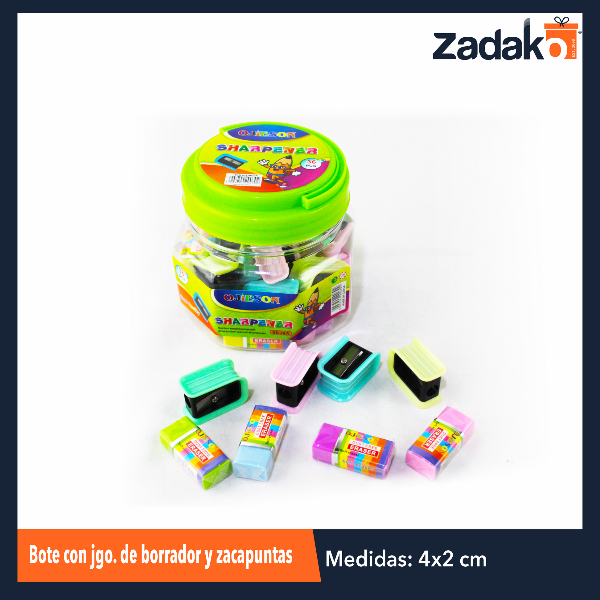ZP-0935 BOTE CON JGO. DE BORRADOR Y SACAPUNTAS CON 18 PZS CON 1 PZ O CAJA CON 60 PQTS
